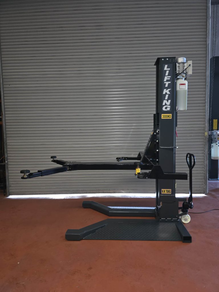 The new Lift King LK- SP30 Portable Single Post 3.0T Service Hoist is extremely versatile as it can perform all the vehicle servicing jobs of a standard 2-post hoist but with the added benefits of being easily and quickly moved by one operator and it only takes up a small amount of workshop space.